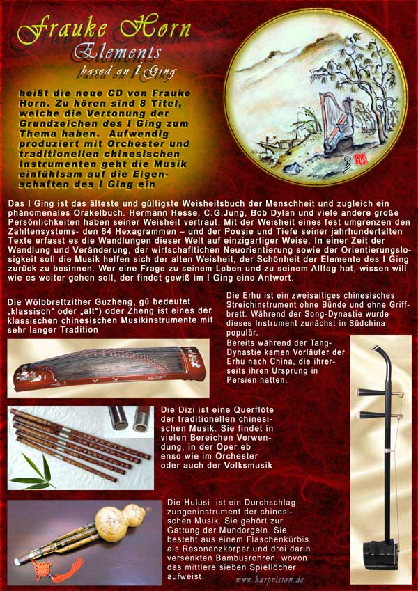 GuZheng. Hermann Hesse: C,G, Jung: Das I Ging bietet sich nicht von selbst mit Beweisen und Resultaten an; es rühmt sich nicht, und es ist auch nicht einfach, sich ihm zu nähern. Es ist ein Teil der Natur, wartend, bis man es entdeckt. Es bietet weder Fakten an, noch Macht, aber für die, die auf Selbsterkenntnis aus sind, auf weises Verhalten - wenn es das gibt -, für die scheint es das richtige Buch zu sein. Hier die MP3 Hörproben, bitte beachten, die Tonqualität ist bei MP3 stark reduziert. Bevor Sie einen neuen Titel starten muss ein Laufender beendet werden. Hier hören Sie alle Titel nacheinander